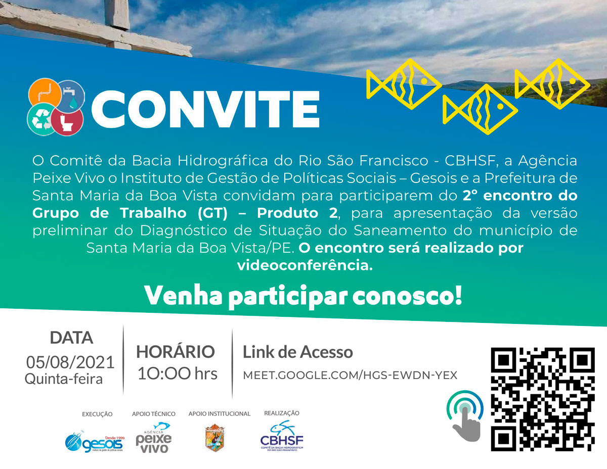 Em continuidade com as atividades de elaboração do Plano Municipal de Saneamento Básico – PMSB do município de Santa Maria da Boa Vista/PE, convidamos a todos para o 2º ENCONTRO DO GRUPO DE TRABALHO, O evento será realizado por meio de videoconferência.