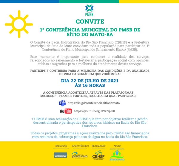 Entre os dias 22 e 29 de julho, os municípios de João Dourado, Sítio do Mato, Campo Alegre de Lourdes e Pilão Arcado, na Bahia, realizarão a 1ª Conferência Municipal para elaboração do Plano Municipal de Saneamento Básico (PMSB), em formato online.